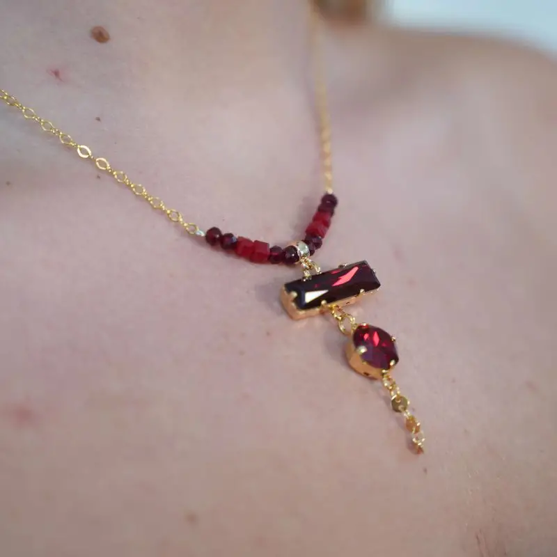 התכשיטים משובצים באבני קריסטל אוסטריות או צ׳כיות, זרקונים, אבני חן טבעיות חצי יקרות, פנינים מתורבתות.