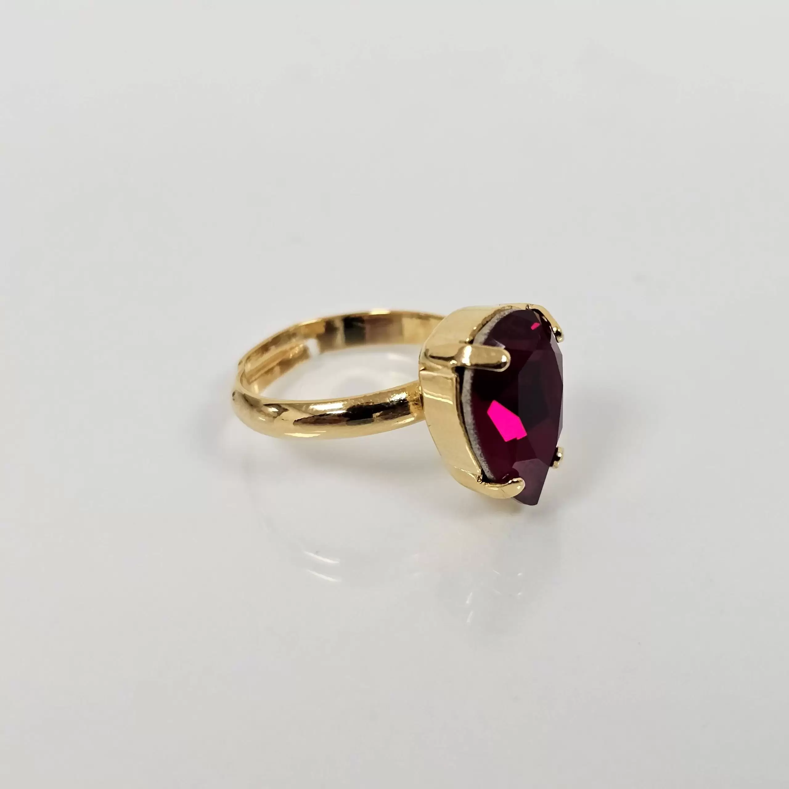 טבעת מלכותית המשדרת יוקרה, משובצת באבן קריסטל בצורת טיפה בצבע בורדו. טבעת נפתחת מאחור, מתכווננת לכל מידה. מעוצבת בעבודת יד ממתכת פליז ומצופה בכסף / זהב 24K.