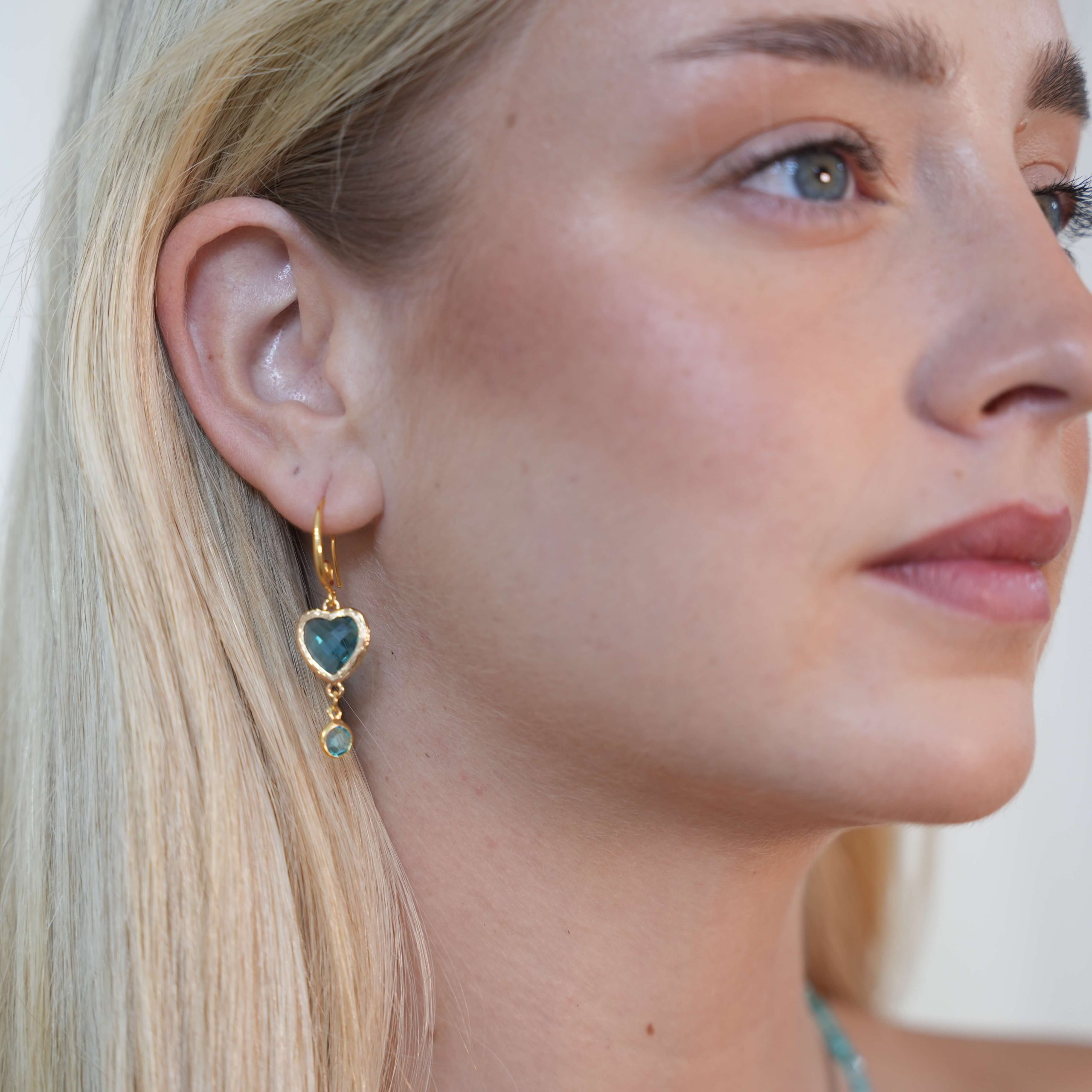 עגילי קריסטל בצורת לב עם קריסטל עגול נתלה, בגווני טורקיז עשויים בעבודת יד מצופים זהב 24K.