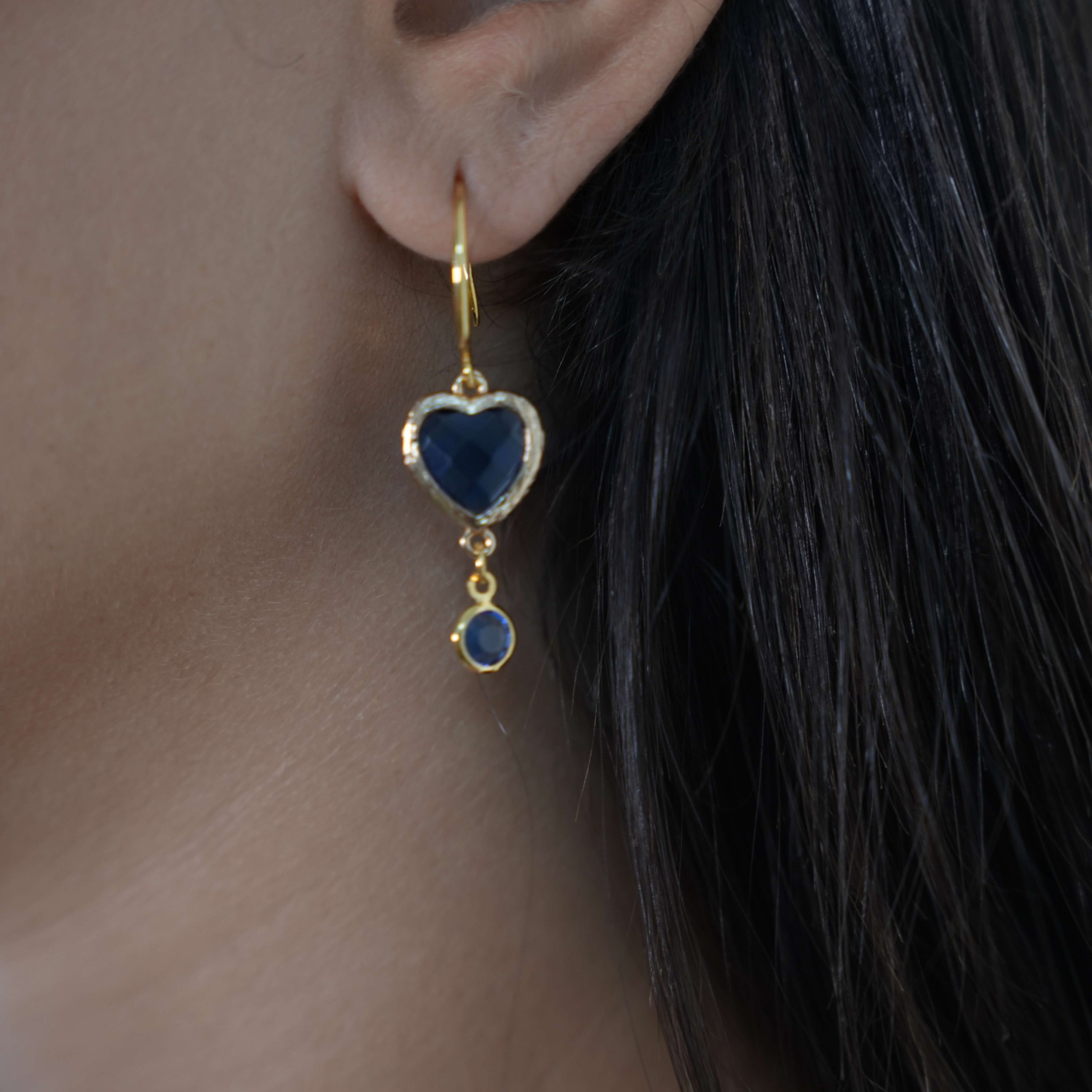 עגילי קריסטל בצורת לב עם קריסטל עגול נתלה, בגווני כחול עשויים בעבודת יד מצופים זהב 24K.
