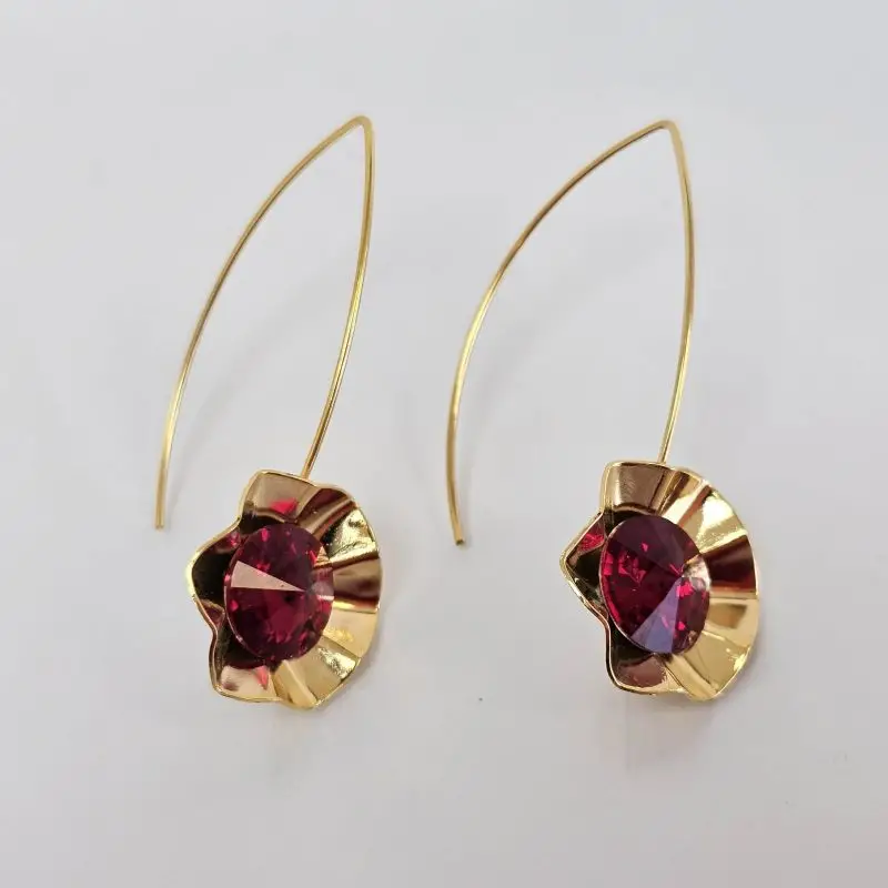 עגיל ארוך ומיוחד מעוצב בעבודת יד עם פרח משובץ בקריסטל אדום, עשוי מתכת פליז מצופה כסף / זהב 24K.