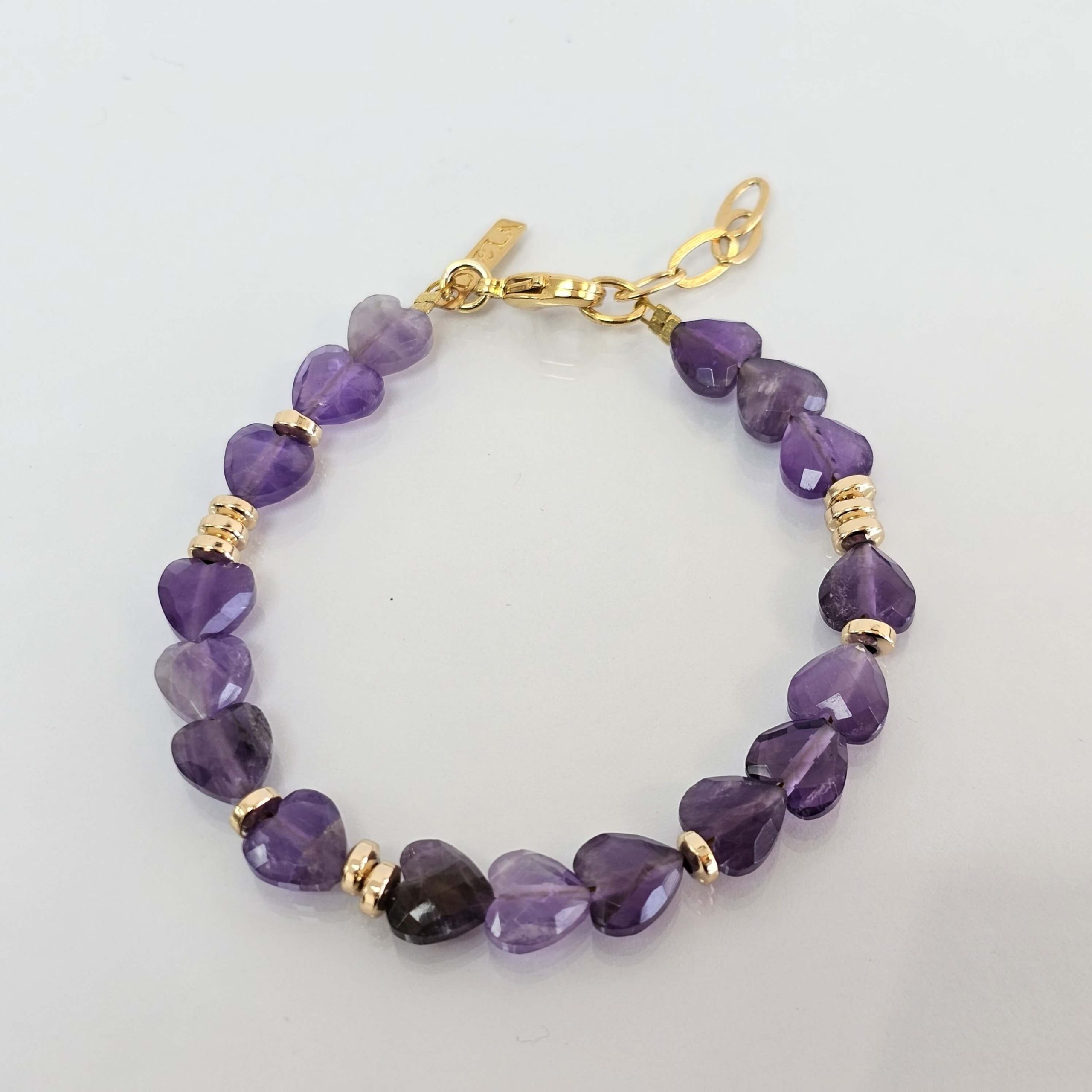 צמיד חרוזי לב מאבנים טבעיות משולב חרוזים בגווני סגול, בתוספת חרוזי מתכת בצבע זהב. מעוצב בעבודת יד.