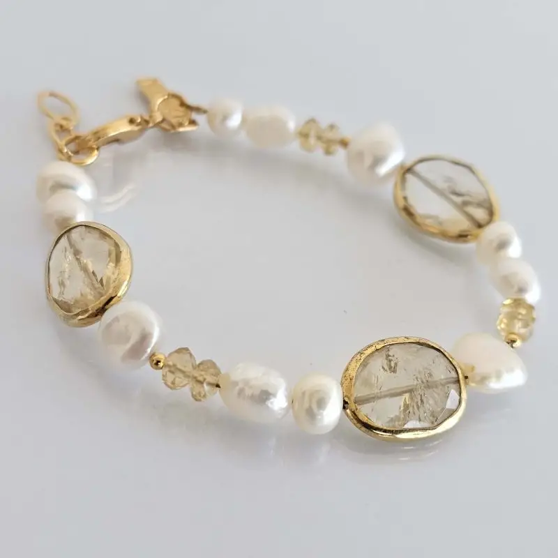 התכשיטים משובצים באבני קריסטל אוסטריות או צ׳כיות, זרקונים, אבני חן טבעיות חצי יקרות, פנינים מתורבתות.