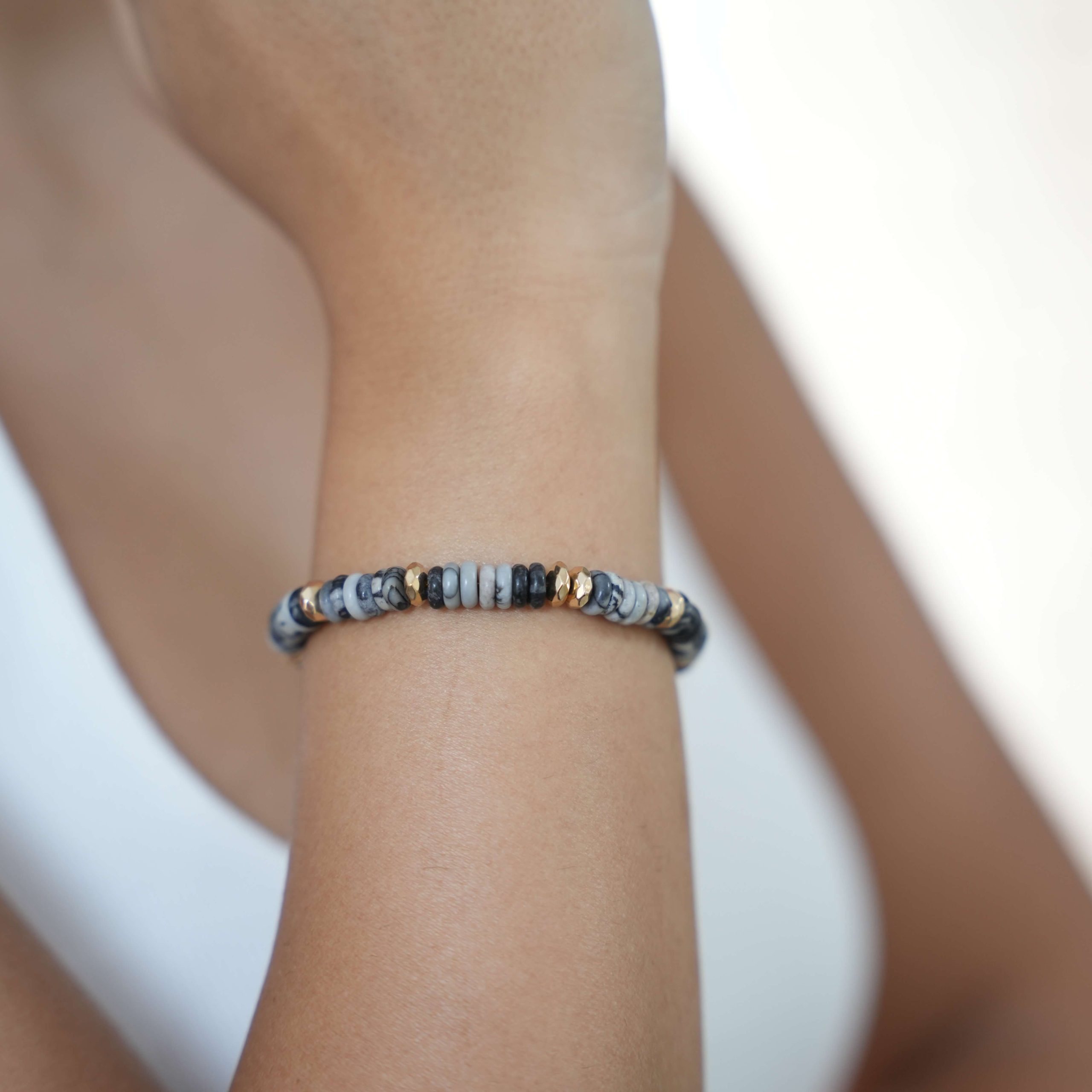 צמיד חרוזי שייבה מאבנים טבעיות משולב חרוזים בגווני אפור, בתוספת חרוזי מתכת בצבע זהב. מעוצב בעבודת יד.
