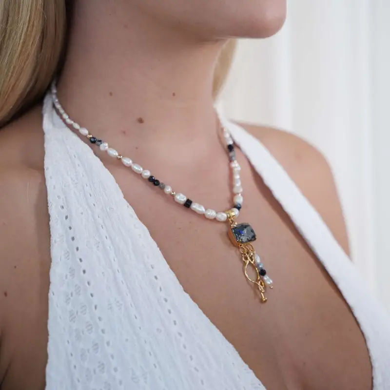 התכשיטים משובצים באבני קריסטל אוסטריות או צ׳כיות, זרקונים, אבני חן טבעיות חצי יקרות, פנינים מתורבתות.
