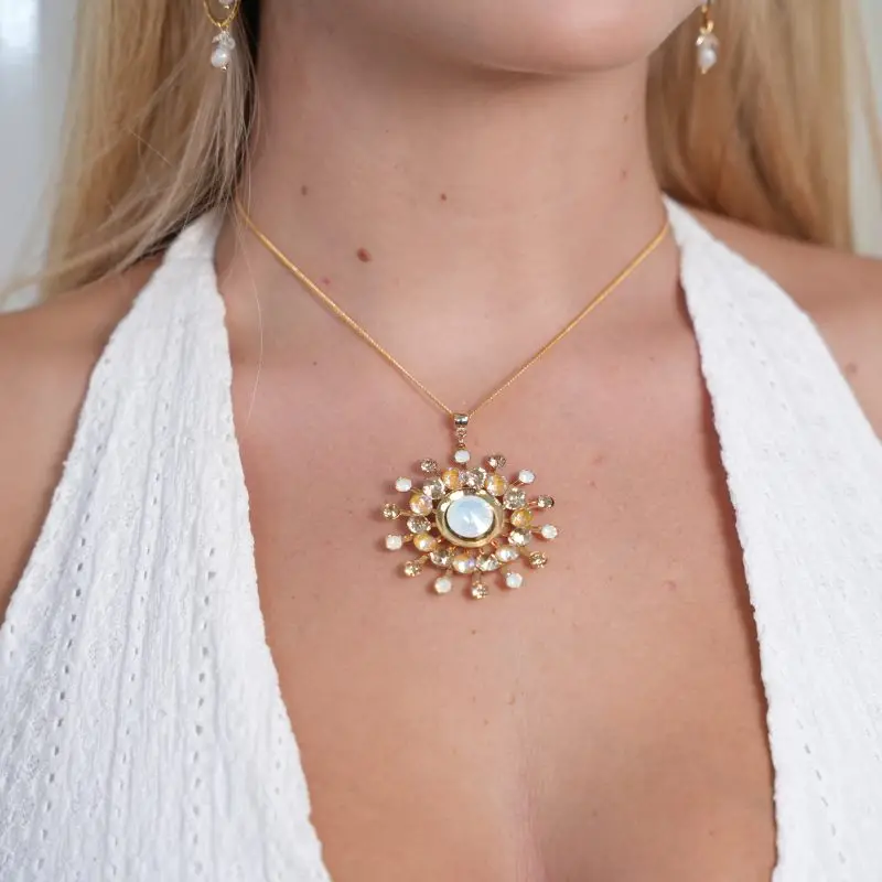 אורך השרשרת כולה 39 ס”מ + 5 ס”מ הארכה. אורך התליון 5.5 ס”מ. קוטר השמש 4.5 ס”מ.
